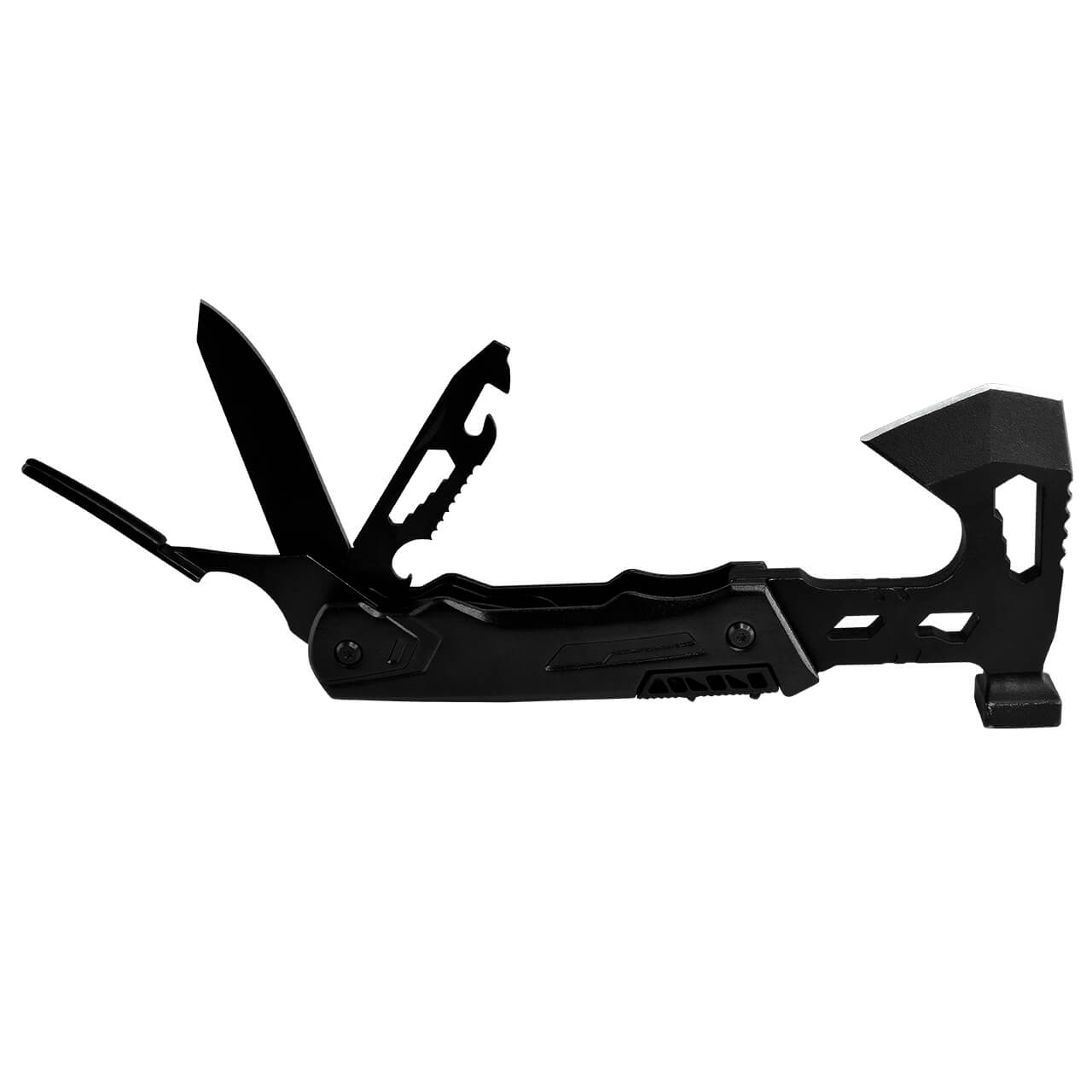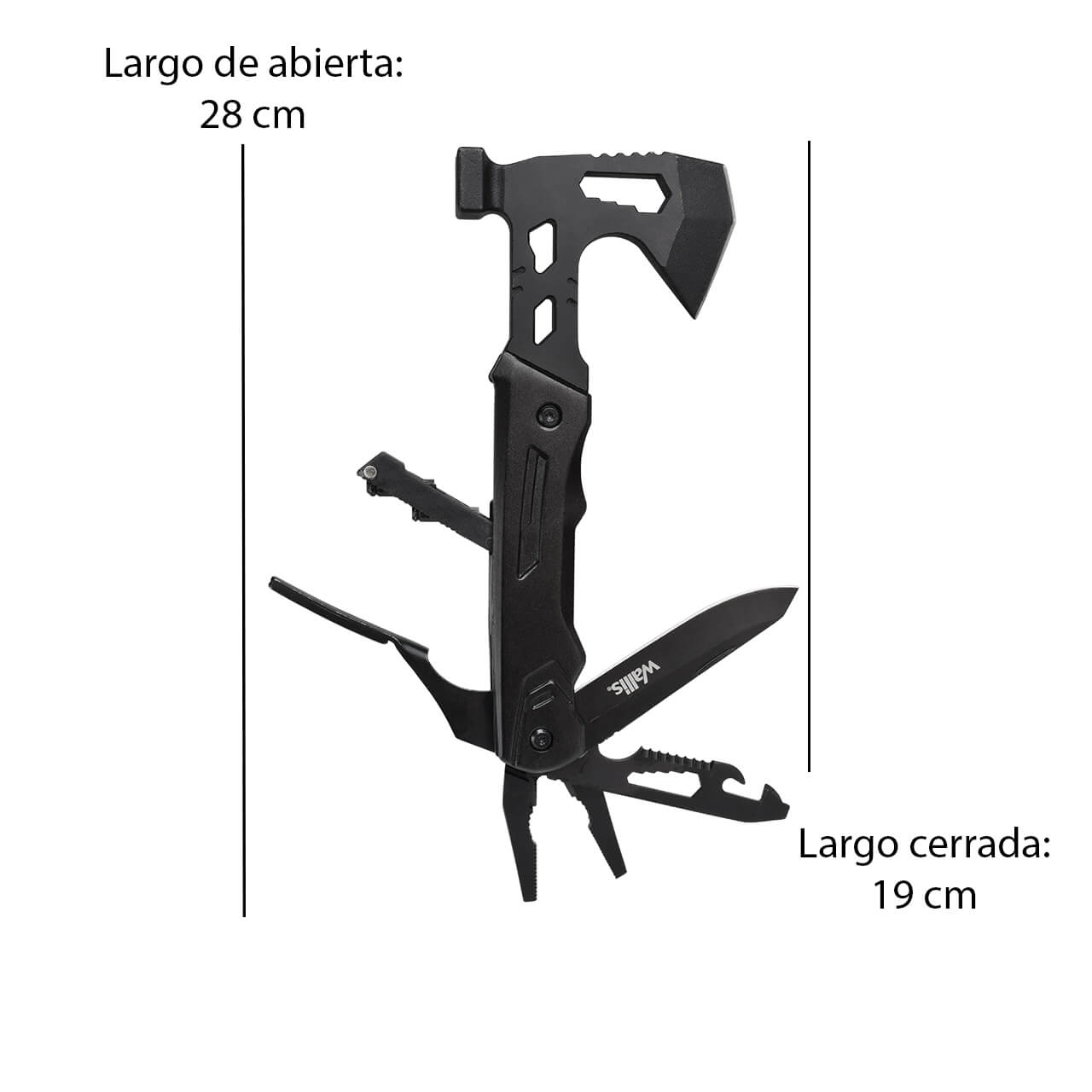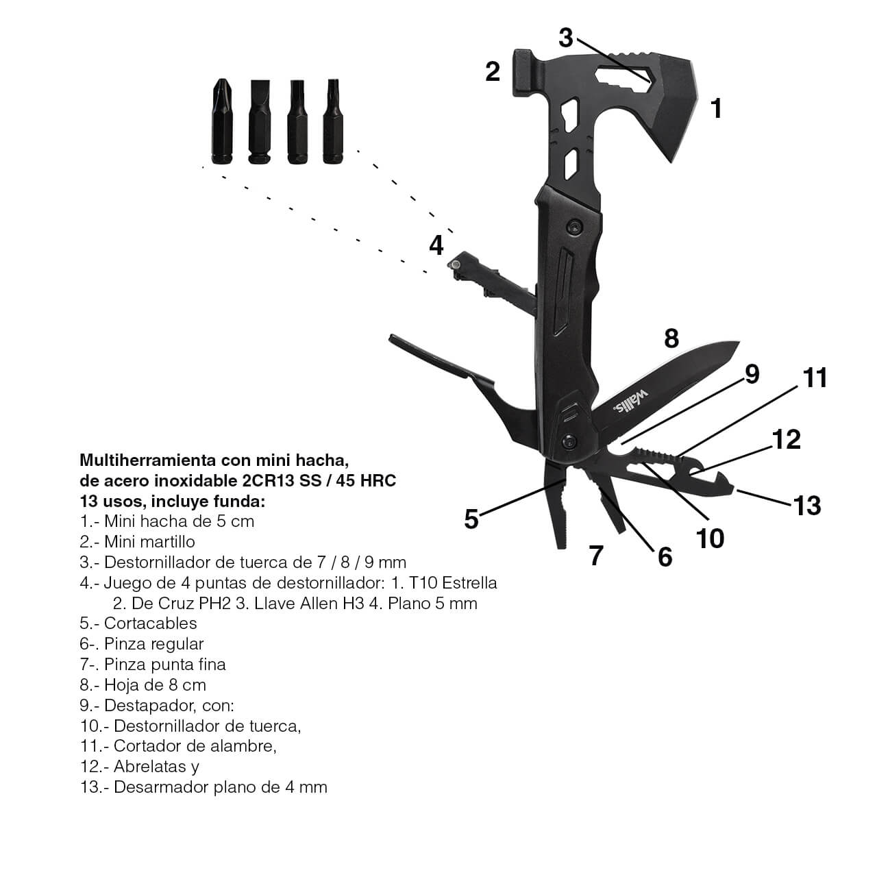 • 13 usos: 1.- Mini hacha de 5 cm 2.- Mini martillo 3.- Destornillador de tuerca de 7 / 8 / 9 mm 4.- Juego de 4 puntas de destornillador: 1. T10 Estrella 2. De Cruz PH2 3. Llave Allen H3 4. Plano 5 mm 5.- Cortacables 6-. Pinza regular 7-. Pinza punta fina 8.- Hoja de 8 cm 9. Destapador, con: 10.- Destornillador de tuerca, 11.- Cortador de alambre, 12.- Abrelatas y 13.- Desarmador plano de 4 mm