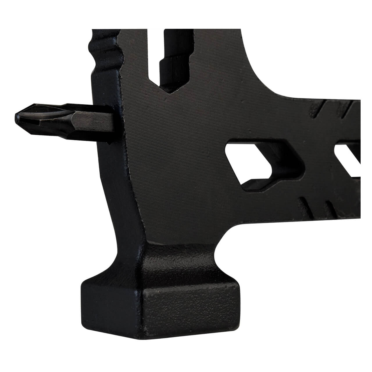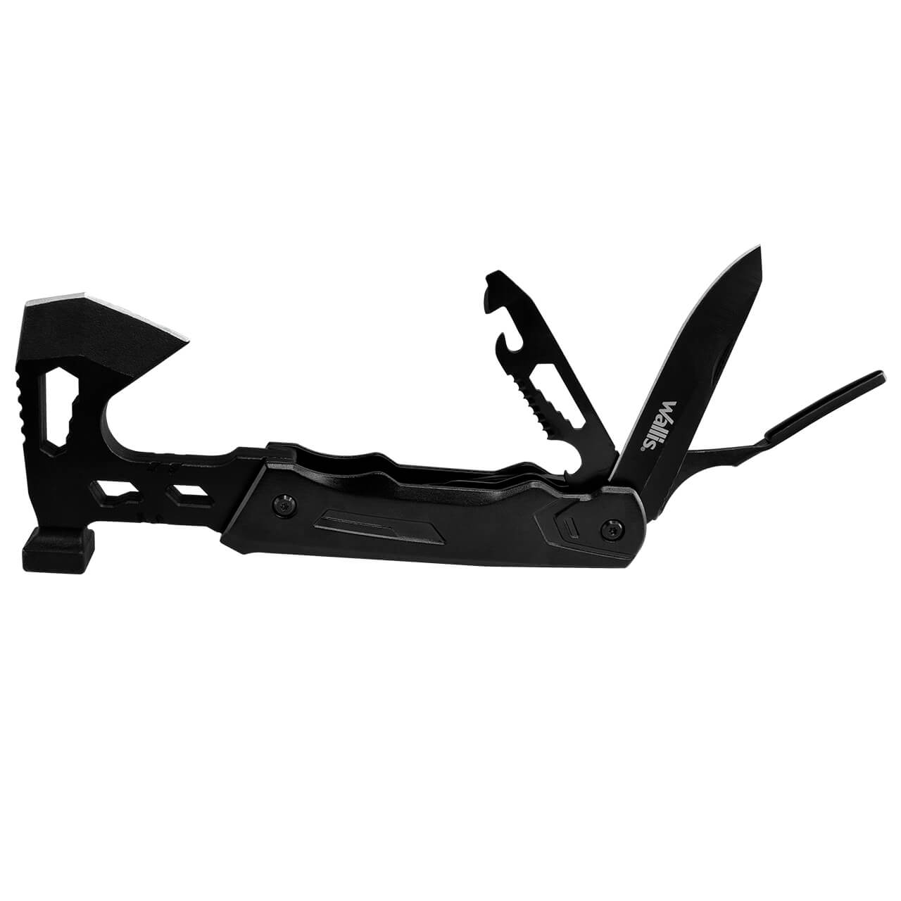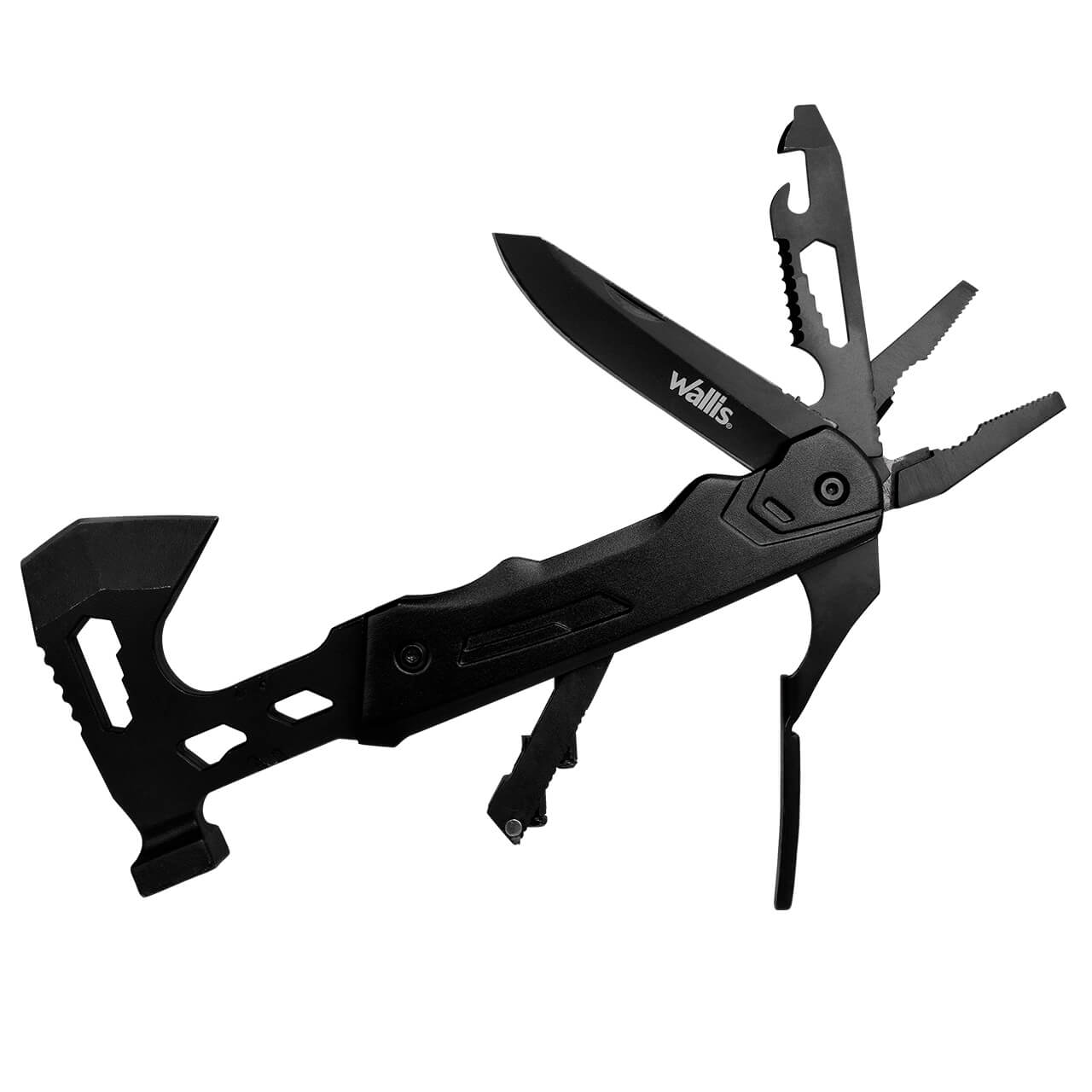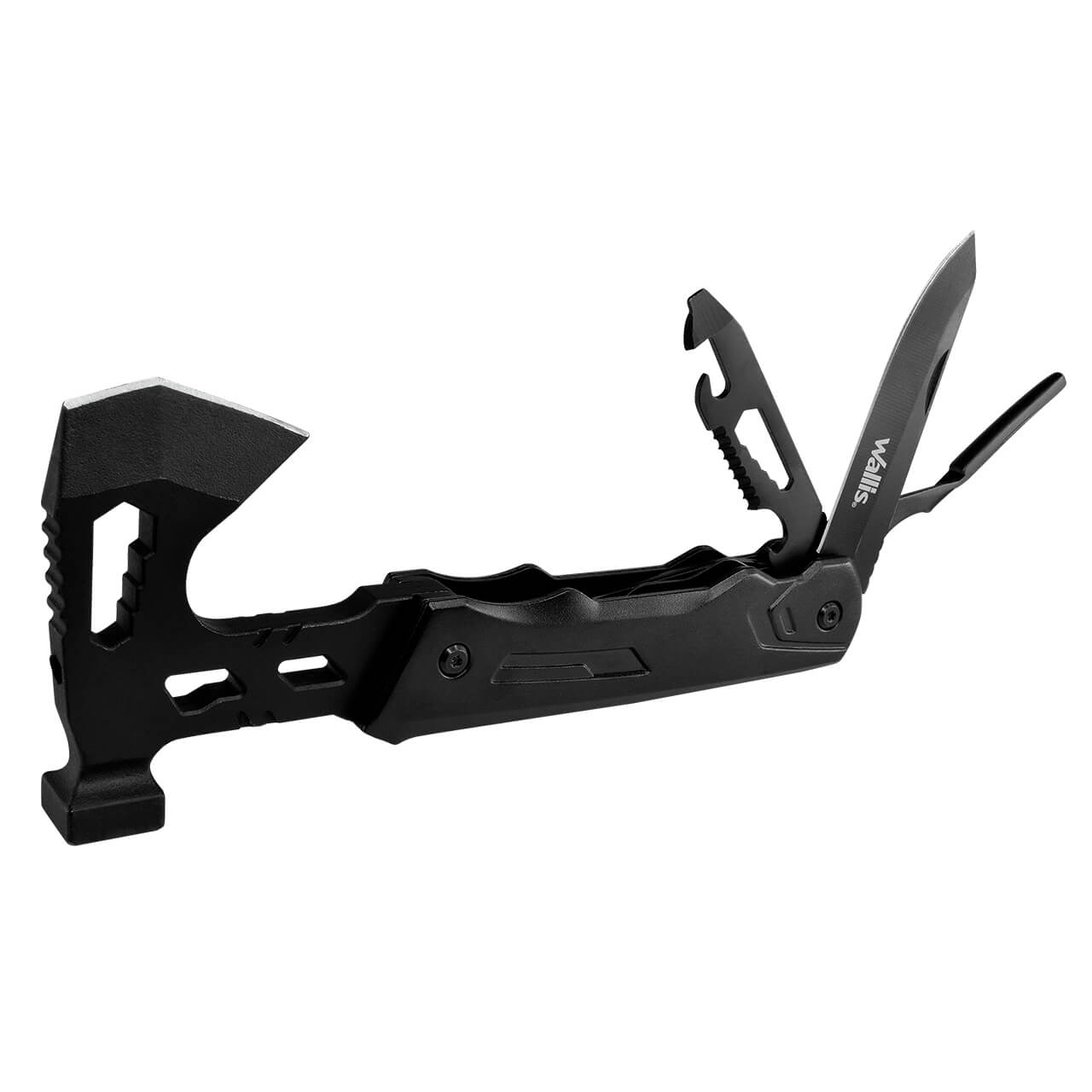 • 13 usos: 1.- Mini hacha de 5 cm 2.- Mini martillo 3.- Destornillador de tuerca de 7 / 8 / 9 mm 4.- Juego de 4 puntas de destornillador: 1. T10 Estrella 2. De Cruz PH2 3. Llave Allen H3 4. Plano 5 mm 5.- Cortacables 6-. Pinza regular 7-. Pinza punta fina 8.- Hoja de 8 cm 9. Destapador, con: 10.- Destornillador de tuerca, 11.- Cortador de alambre, 12.- Abrelatas y 13.- Desarmador plano de 4 mm