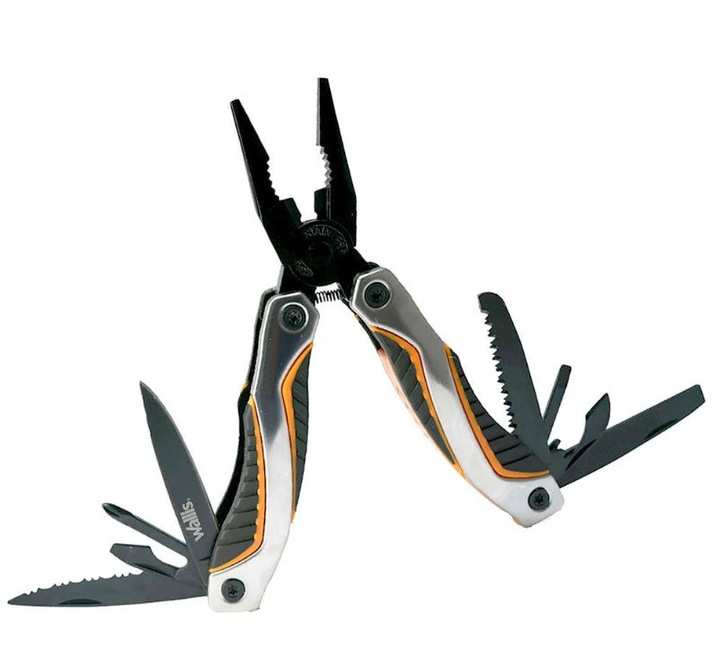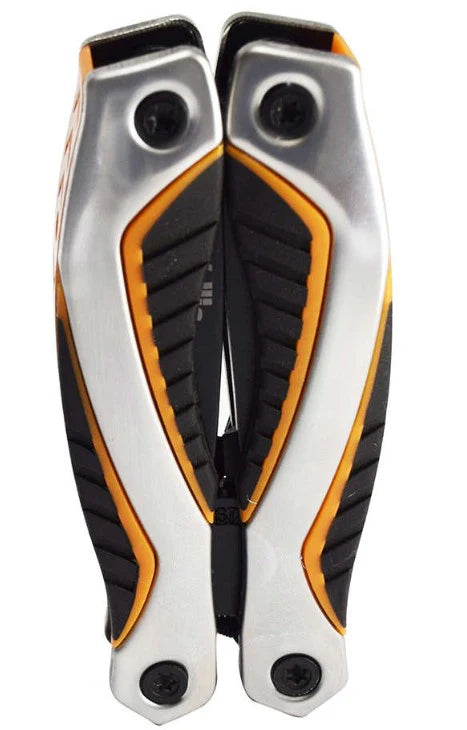 Multiherramienta de acero inoxidable con dureza de 48-52, incluye 13 funciones para desempeñar tus tareas de forma rápida y sencilla, puedes encontrar una pinza cerrada de 10 cm, cortacables, desarmadores, lima de uñas, abrelatas y muchas herramientas más.
